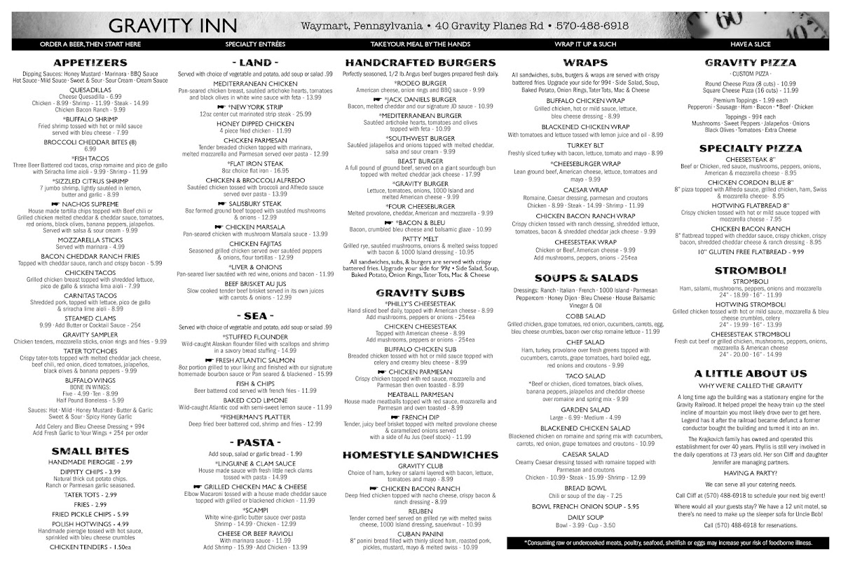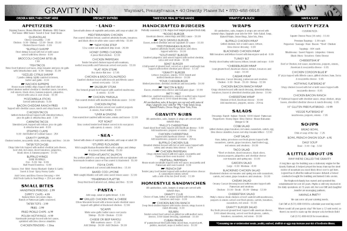 Welcome to Gravity Restaurant & Bar, a hidden gem located at 40 Gravity Planes Rd, Waymart, PA. This cozy establishment invites you with its clean dive bar ambiance and a welcoming atmosphere that many guests rave about. The menu boasts a diverse array of options, from flavorful wings that are beautifully sauced to generous blackened chicken salads packed with tender meat.